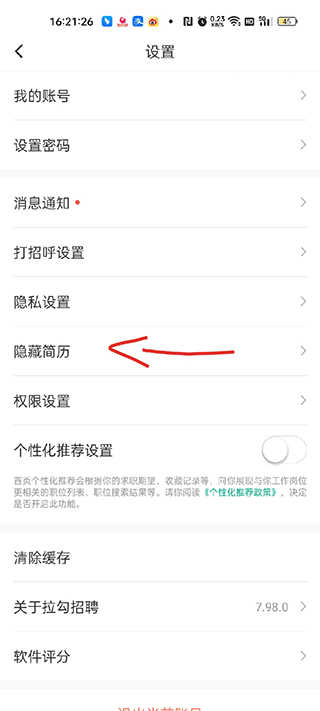 2、进入设置后往下滑动,找到隐藏简历的选项,点击进入;