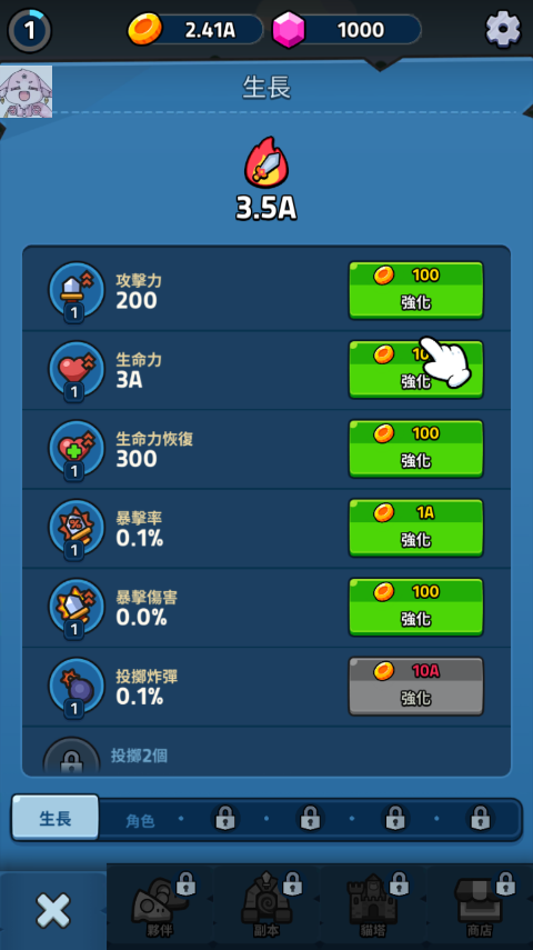 3、持续提升角色战力是通关关键:通过消耗资源强化攻击力、生命值、暴击率与技能冷却等核心维度,让猫咪在面对高难度敌人时更具生存力与爆发力。