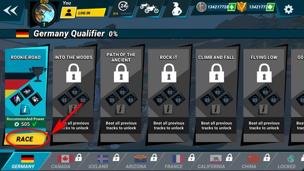 2、在赛道选择页浏览全部可用地图,确认后点击右下角【RACE】按钮,系统将自动为你匹配实力相近的对手。