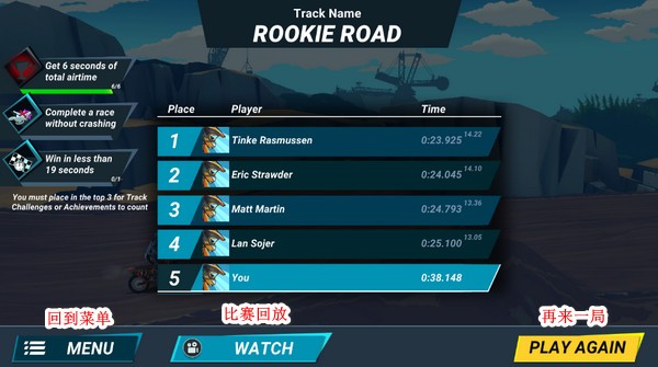 5、失误翻车?别担心!赛后可即时回放全程精彩(或狼狈)瞬间,也可一键【RETRY】重新挑战,技术提升就在一次次起落之间。