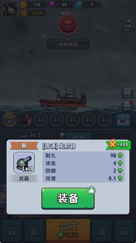 1、进入游戏后,点击【合成】即可随机获得装备。每件装备自带基础属性,成功合成高等级装备后可直接装配至战舰,显著提升火力、防御或机动等核心战力。