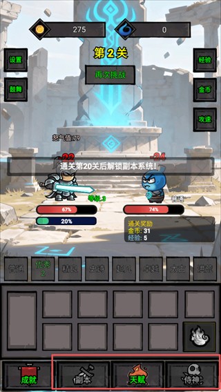 通关第20关开启副本系统,第50关解锁侍神玩法。建议前期专注推进主线关卡,稳步积累战力与资源,为后续深度内容做好充分准备。