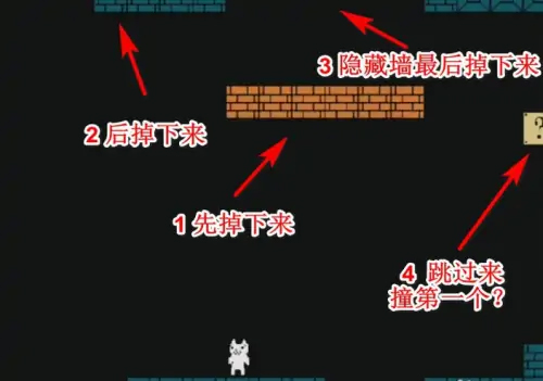 1、绿色问号道具拾取后将导致脚下地面整体塌陷,务必在触发前完成起跳;前方缺口上方藏有隐藏方块,顶出后可构建安全跳板。