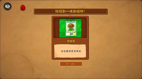 4、打败所有僵尸即可闯关成功,获得新植物,在新手关卡中可以将植物慢慢解锁,从而能够搭配出不同的塔防阵型。