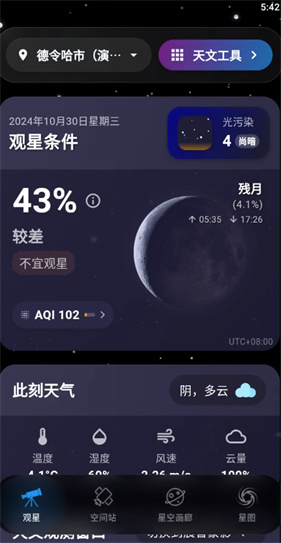 天文通在实用性与专业性之间取得了出色平衡。它不仅整合了日出日落、月升月落、月相变化等基础天文数据,更将24小时内高精度天气预报、空气污染指数、大气透明度评估等关键变量统一呈现。用户可在单页内同步获取天气、云量、月光干扰、银河位置等多维信息,真正实现“一屏决策”,显著提升天文观测、延时摄影及科普活动的准备效率与成功率。