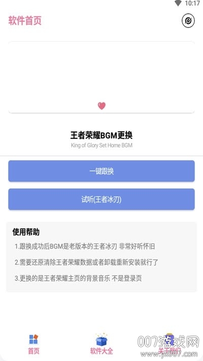 这是一款轻量实用的王者荣耀专属辅助软件,界面简洁、操作直观,上手零门槛。用户可自由浏览并选择内置BGM资源,一键应用至游戏主页,既满足怀旧情怀,也适配当下个性化表达需求。