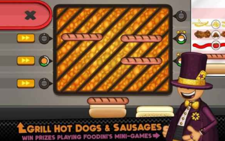 2. 前往点餐台接收实时订单,迅速返回厨房执行标准化制作流程——从烤制多汁热狗与香肠,到精准控温出炉,全程节奏紧凑不失真实感;