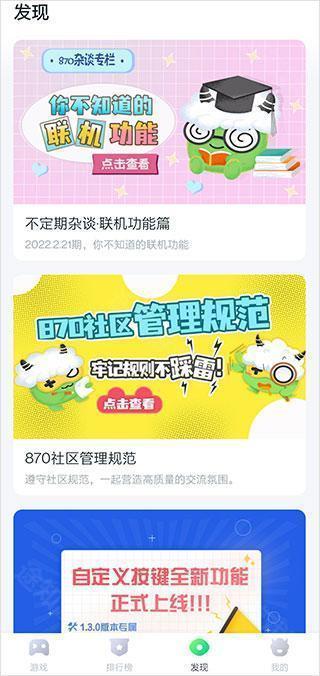 870手机盒子是一款集游戏下载、攻略学习、联机互动与社区交流于一体的全能型手游辅助平台。它不止是“盒子”,更是玩家的游戏中枢——海量正版游戏免广告直装、全网独家首发礼包、高手亲撰深度攻略、一键组队实时联机、活跃玩家社群即时互动,真正实现“下得快、玩得懂、组得上、聊得嗨”。无论你是新手入门,还是硬核老玩家,这里都有为你量身定制的游戏体验。