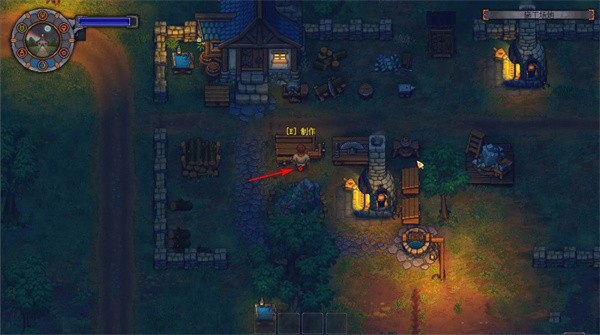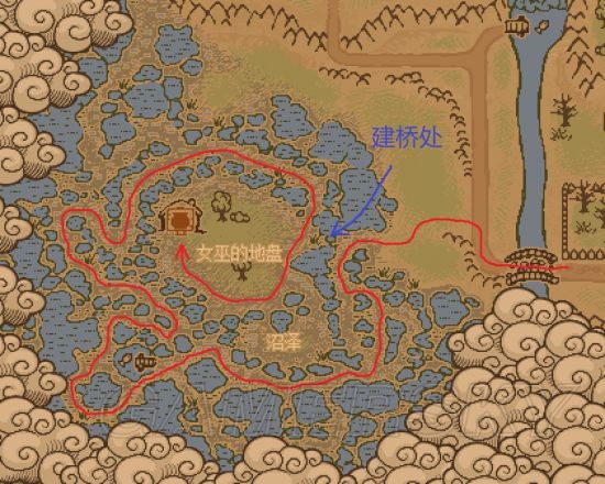 2、找到女巫 建设墓园左侧桥梁后,即可通往沼泽区域(亦可从小屋上方陆路抵达,但路径迂回)。女巫居所位于沼泽中央,地形看似复杂,实则顺时针行进基本无岔路,配合场景标识易于辨识。图中蓝色箭头所示木牌位置可建造快捷桥梁,大幅缩短往返距离。