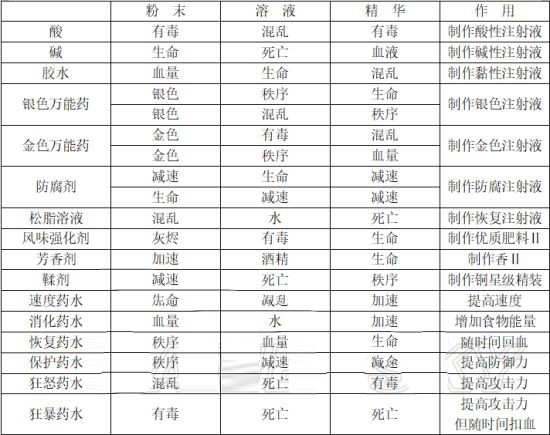 4、炼金配方表 完整炼金配方涵盖从基础药剂到高阶功能物品的全部组合逻辑,以下为关键配方汇总图示: