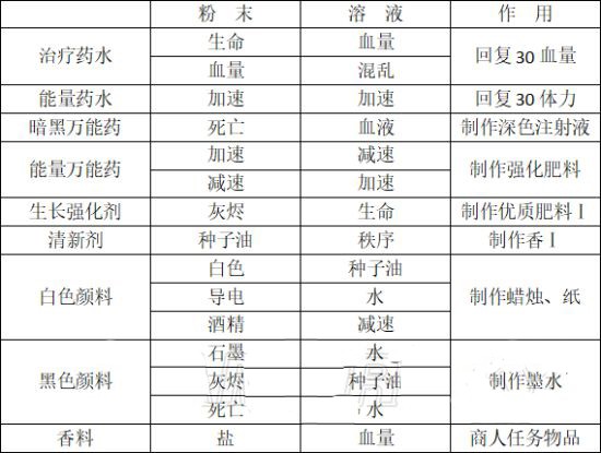 原料按效果分为八种常规属性:加速、减速、血量、有毒、秩序、混乱、生命、死亡,各具专属颜色标识。全部24种(8×3)常规原料均可在女巫处直接购得。此外,部分非常规粉末暂无对应溶液或精华形态。