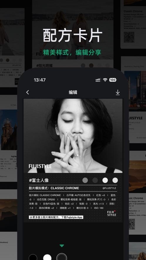iCloud自动备份全部胶片配方与拍摄笔记,换机、重装APP后数据无缝恢复,创作积累永不丢失;快速生成高清可分享的富士配方卡片,支持自定义标题、备注与参数高亮,便于教学、交流或个人归档;集成轻量级拍摄模块,兼容手机摄像头,支持风景、人像、自拍等多种场景优化,即开即拍,即时应用富士色彩风格;提供自由裁剪、比例锁定(1:1/4:3/16:9等)、智能边缘识别辅助等功能,轻松适配社交平台发布需求或印刷输出规格。