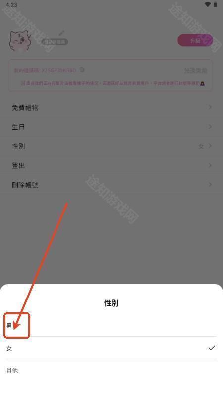 在弹出的选择面板中,自由切换男性、女性或自定义性别标签,确认后立即生效。