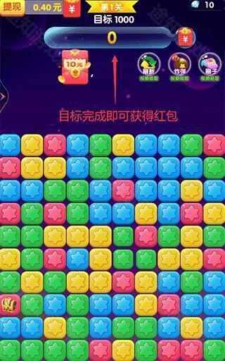 消除星星乐红包版是一款轻松上手、趣味十足的休闲益智三消游戏。区别于传统消除玩法,本作专为喜欢边玩边赚的用户打造红包版——每完成一次关卡挑战,即可积累金币,达到指定额度后直接提现成现金!游戏延续经典“三连消除”机制,只需将三个相同图案的星星(或可爱动物方块)排成一线即可触发消除,操作零门槛,新手30秒就能畅玩。卡通画风清新治愈,萌系角色全程助阵,搭配轻快音效与沉浸式背景音乐,让每一次点击都充满期待感。