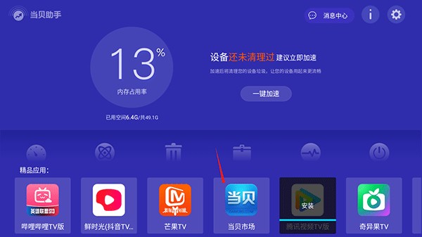 1、使用遥控器方向键持续向下导航,进入“精品应用”专区,找到并点击“当贝市场”进行下载安装;
