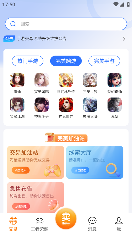 2、登录成功后,首页即刻呈现完美世界全系列游戏专属交易入口,分类清晰、更新及时,热门商品实时滚动推荐。