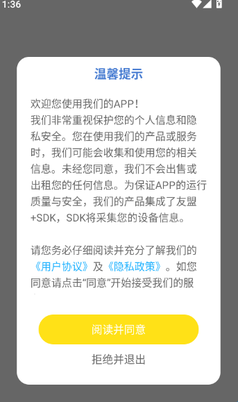 1、启动应用后,阅读“温馨提示”并点击“阅读并同意”,正式进入主界面