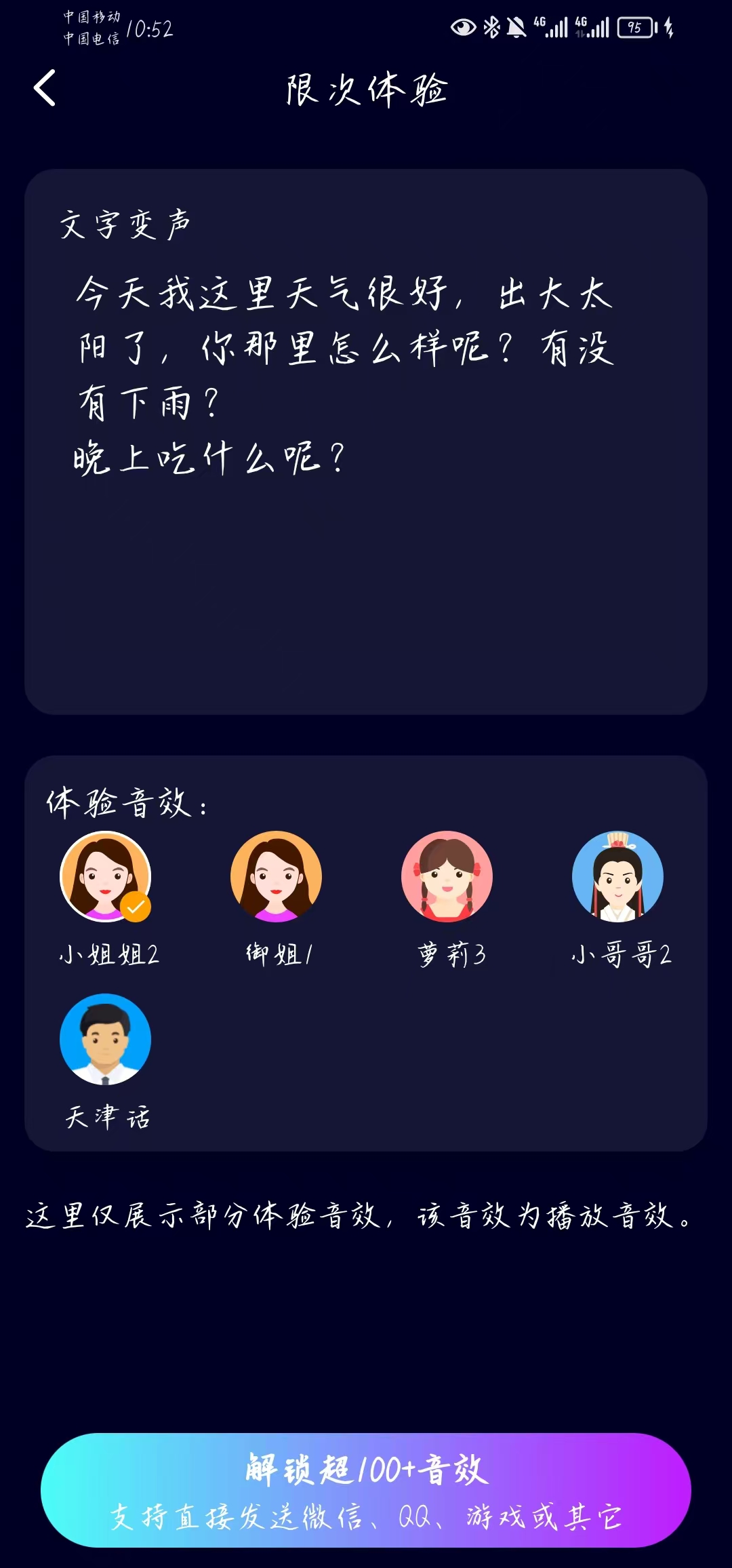 文字变声:输入文字即可合成语音,涵盖多种拟人化音色,适用于配音、趣味留言、创意短视频旁白等场景。