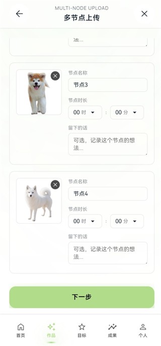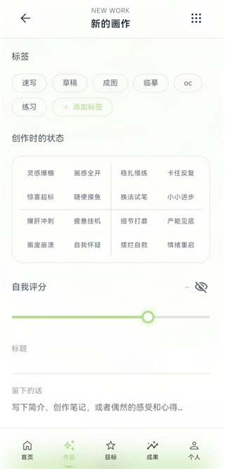 作品记录与管理:支持上传完整作品、练习草稿及多节点创作过程,可添加绘画时长、标签、自我评价等详细信息,并进行分类整理与永久保存。