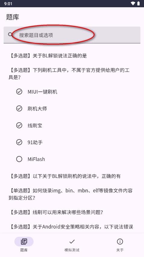 2、打开APP后进入主界面,在顶部搜索栏输入关键词(如“Fastboot”“保修”“数据清除”等),即可快速定位高频考点题目。