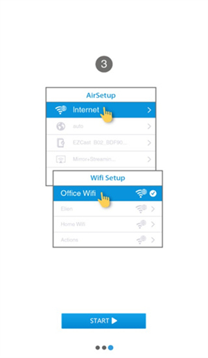 1、打开 EZCast 应用,点击首页第一个方框;同时开启你的投影仪或 EZCast 推送宝设备,在手机 Wi-Fi 列表中搜索以 “ezc” 开头的无线信号并连接。