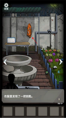 - 进入精神病院外围后,先在花坛找到弹珠,再从院子墙上的环卫工衣服中取得钥匙;