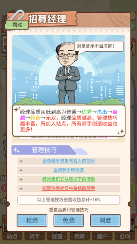 4. 所有订单均由骑手配送,确保顾客满意;游戏操作简单,自由度高,即使离线也能持续收益。