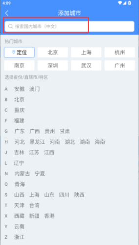 2. 在顶部搜索栏输入城市名称,添加关注地区,支持多城市切换管理。
