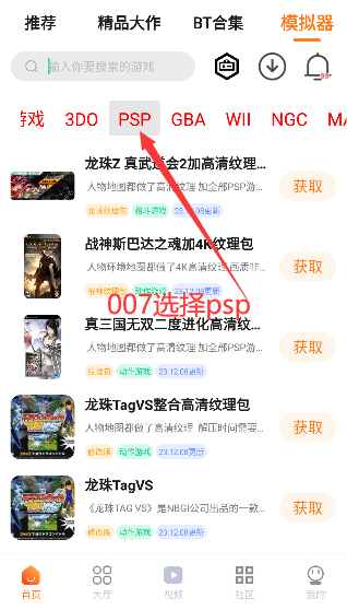 进入应用后,选择内置的模拟器功能,并点击PSP游戏分类。