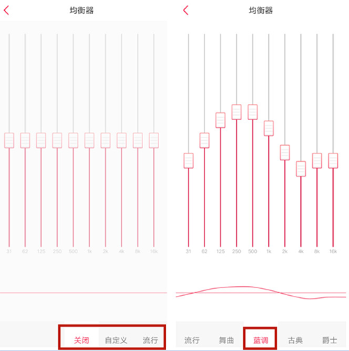 均衡器默认处于关闭状态,开启后支持手动调节,也可直接选择“流行”“舞曲”“蓝调”“爵士”等音乐类型对应的预设方案,快速优化听感。