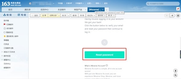 登录邮箱,查找标题为【[Weverse] User password reset XXX】的邮件,点击其中的【Reset Password】链接。