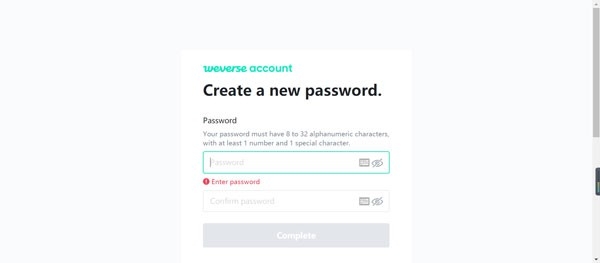 在跳转页面中输入新密码,点击【Complete】即可完成密码重置,重新登录账户。