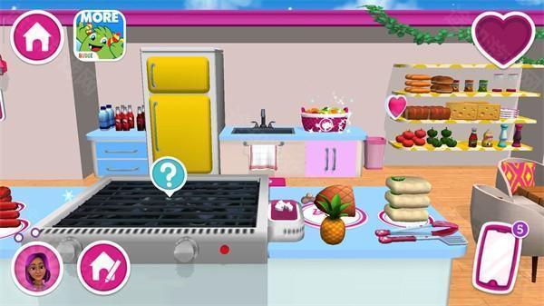 进入游戏后,点击屏幕即可开始你的芭比梦幻之旅。初始场景位于一楼厨房,所有物品的使用方法均可通过点击“?”图标查看。