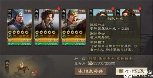 五人全是蜀国阵营的,同时上阵获得12%的属性加成,诸葛亮、庞统、徐庶三人同队获得荆州奇士的羁绊,智力提升5%,给诸葛亮带来输出加成,另外两位武将用黄月英和姜维解锁衣钵相传羁绊,行动结束后提升2%全属性,可叠加八次,持续至战斗结束。