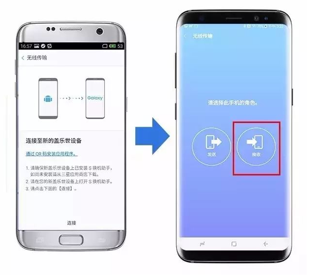 2、建立新旧手机之间的连接。在两台设备上分别选择【发送】或【接收】角色,确认后即可配对成功。