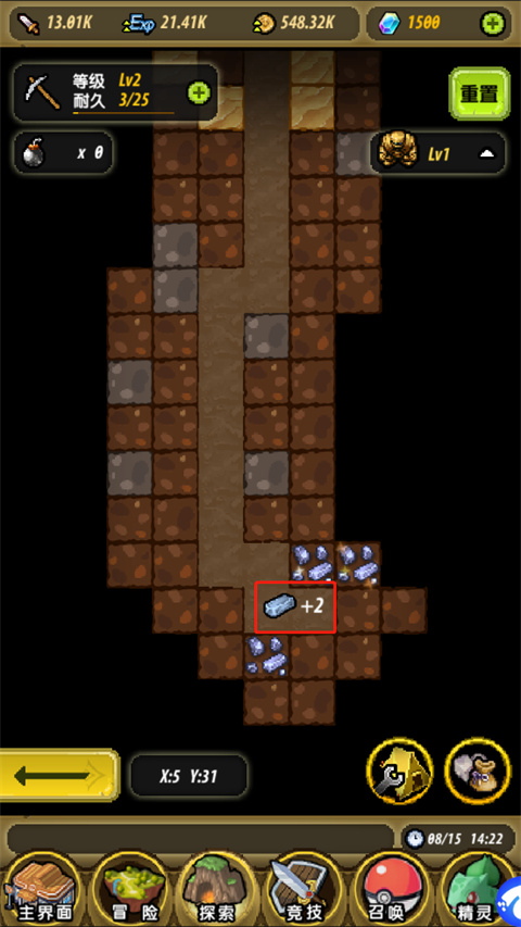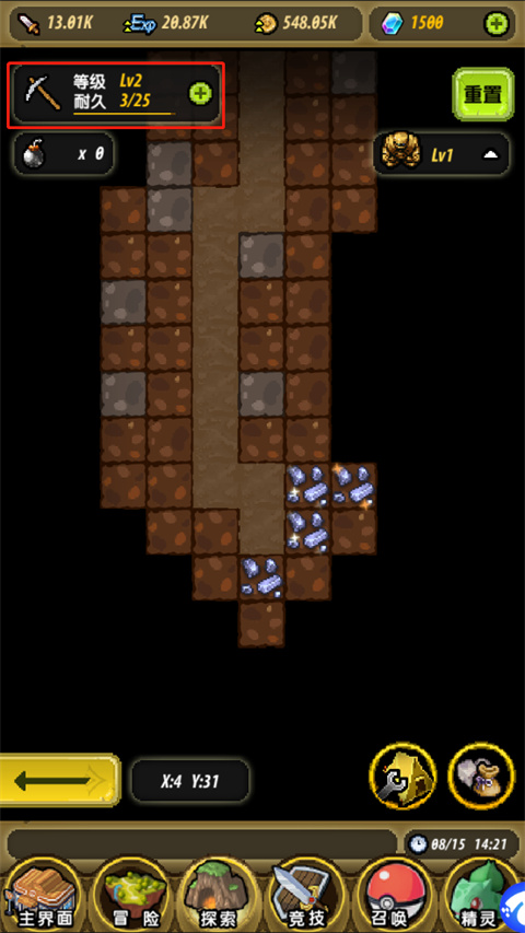 3、在矿区界面,你会看到镐子的等级和耐久度,矿区内有不同等级的矿石,根据矿石等级进行挖掘,挖掘会消耗耐久度;