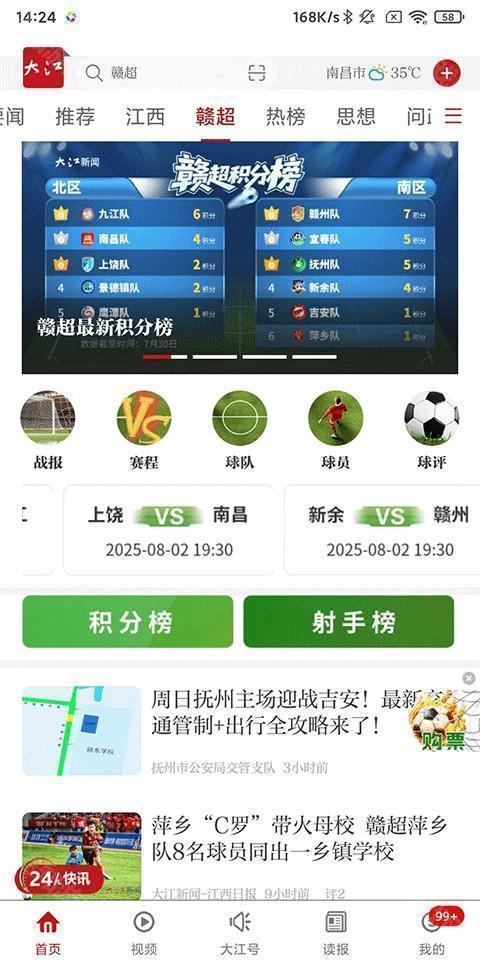 2、进入“看赣超”板块,实时查看江西本土足球联赛各队积分榜、赛程安排及赛事资讯;