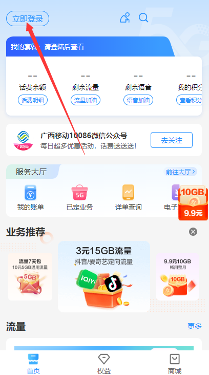 1. 从本站下载“中国移动广西”APP安装包,安装完成后打开应用,点击首页的“立即登录”按钮。