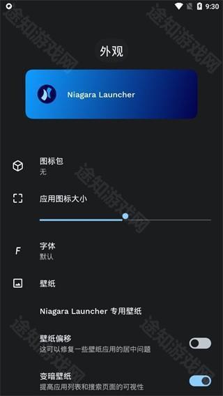 打开 Niagara 设置 →【外观】,可调整主题、图标、字体、壁纸等选项。