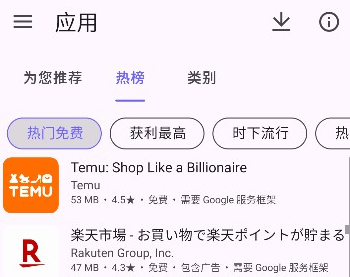1、打开 Aurora Store 后,点击顶部菜单栏,即可按分类浏览各类应用。