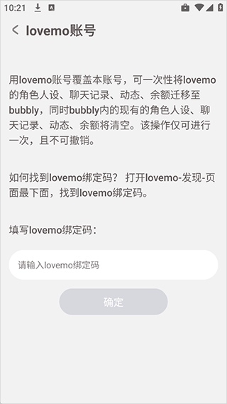 3、选择用Lovemo账号覆盖当前Bubbly账号后,原Lovemo中的角色人设、聊天记录、动态内容及Moly钱包余额将完整迁移至Bubbly,而Bubbly内原有数据将被清空。该操作仅限一次且不可撤销。
