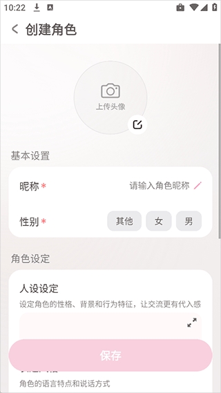 4、进入角色创建页,上传头像,并填写昵称、性别及详细的角色设定(如性格、背景故事、说话风格等),确认后保存。