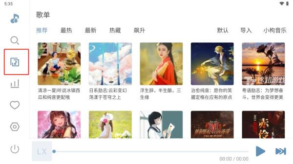 - 点击左侧红框区域的分类图标,可浏览各类主题歌单,按兴趣筛选并收藏;