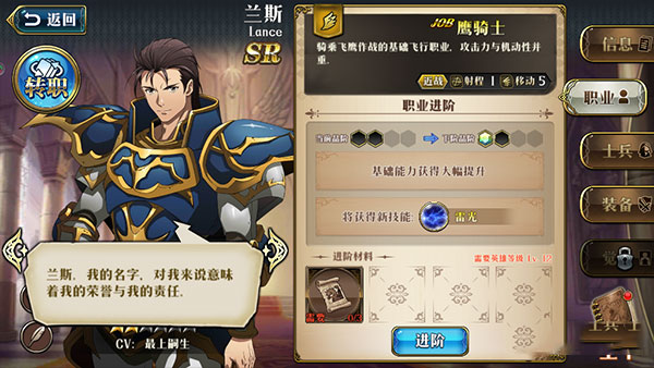 (2)职业转职:英雄在精通前置职业后可进行转职。例如,兰斯可从“鹰骑士”进阶为“皇家骑士”或“龙骑统帅”,转职后将永久获得属性加成。