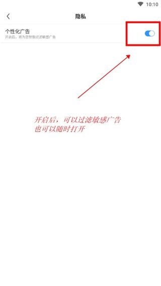3、在隐私设置页面,点击右上角的开关按钮,即可关闭相关广告推送。
