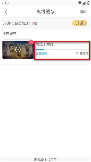 点击“查看缓存”,可进入“离线缓存”页面查看下载进度,缓存完成后即可随时随地离线观看