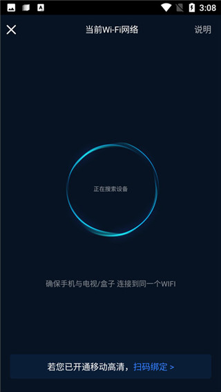 点击投屏图标之后,会自动搜索可投屏的设备。若要投屏到电视,请确保电视已开启并启用无线投屏功能,且手机与电视连接在同一Wi-Fi网络下