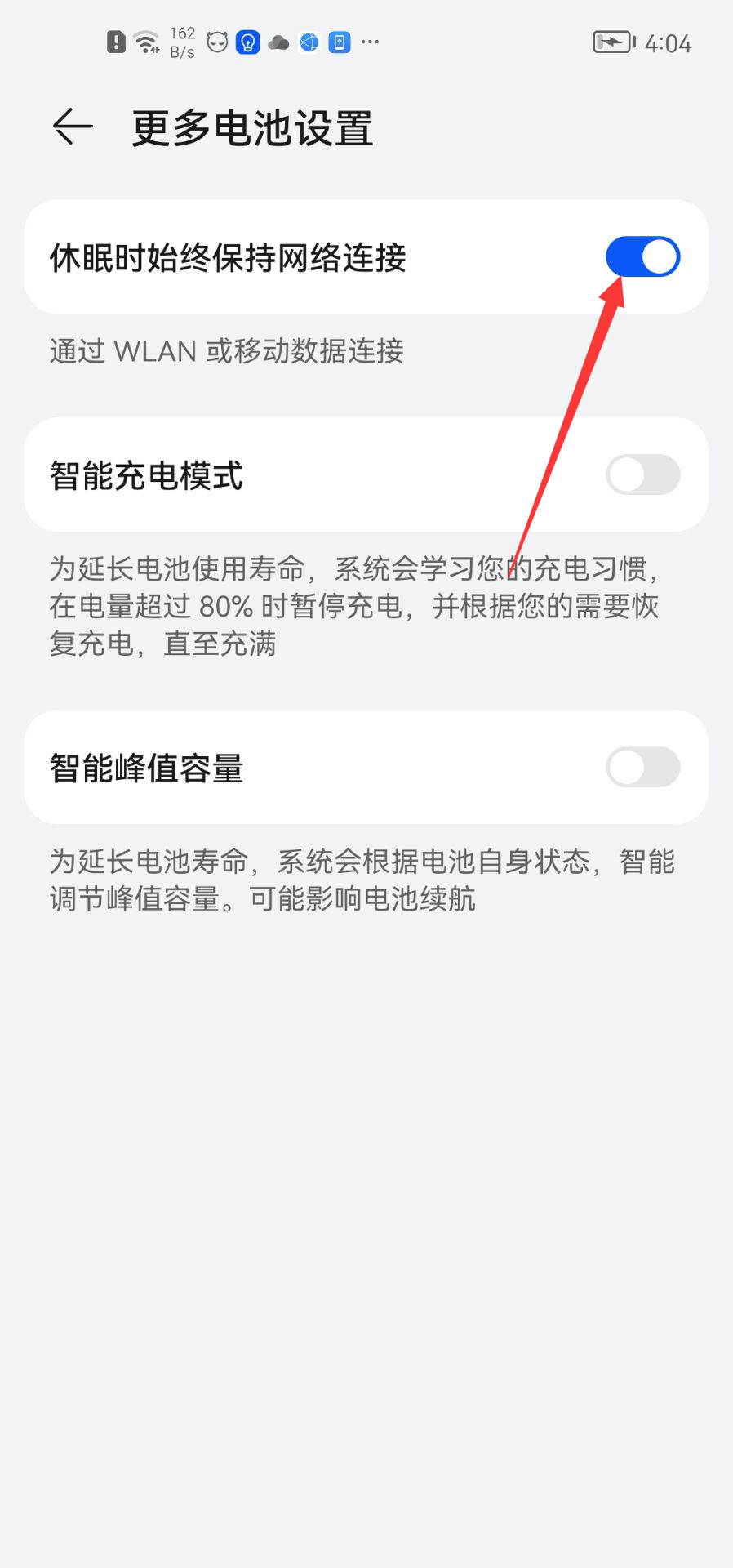 点击【更多电池设置】,开启“休眠时始终保持网络连接”;