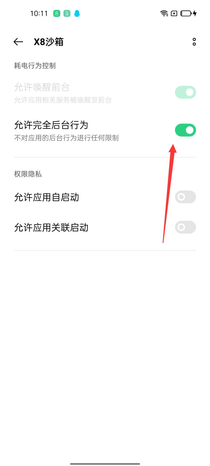 进入【应用耗电管理】,找到x8沙箱,设置为“允许完全后台行为”;