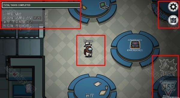 右下角为交互按钮:船员可完成任务、报告尸体或按下紧急会议按钮发起讨论。
